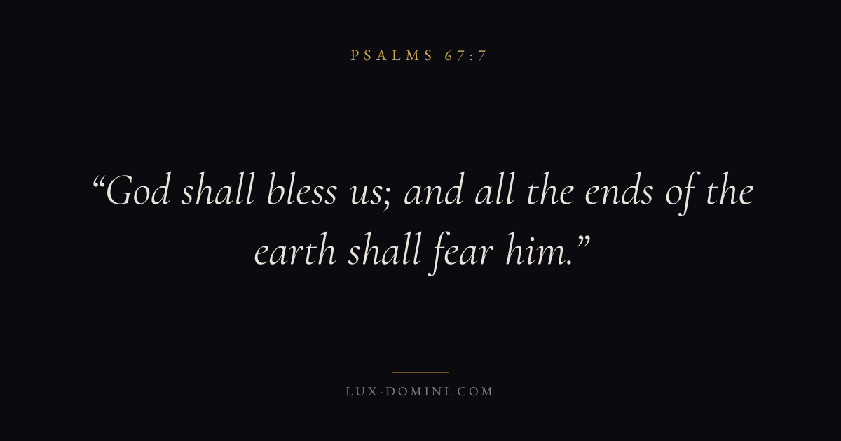Books / Psalms / Chapter 67 / Verse 7 ← Psalms 67:6 Psalms 67:7 Psalms 68:1 → God shall bless us; and all the ends of the earth shall fear him. Download verse card Share on Twitter Share on Facebook Pin it ✦ Key themes FaithAnxiety and fearPrayerPraise Read with Hebrews 11:1Romans 10:17Philippians 4:6Isaiah 41:10 Related topics Bible verses about faithBible verses about anxiety and fearBible verses about prayerBible verses about thankfulness and gratitude ✦ Psalms Chapter 67 verses V. 1 V. 2 V. 3 V. 4 V. 5 V. 6 V. 7
