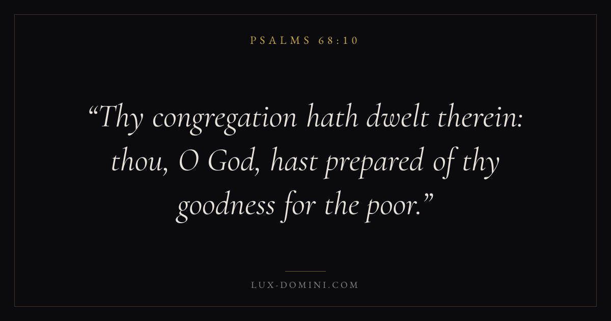 Books / Psalms / Chapter 68 / Verse 10 ← Psalms 68:9 Psalms 68:10 Psalms 68:11 → Thy congregation hath dwelt therein: thou, O God, hast prepared of thy goodness for the poor. Download verse card Share on Twitter Share on Facebook Pin it ✦ Key themes FaithPrayerJustice and mercyPraise Read with Hebrews 11:1Romans 10:17Matthew 6:9Luke 18:1 Related topics Bible verses about faithBible verses about prayerBible verses about justice and mercyBible verses about thankfulness and gratitude ✦ Psalms Chapter 68 verses V. 1 V. 2 V. 3 V. 4 V. 5 V. 6 V. 7 V. 8 V. 9 V. 10 V. 11 V. 12 V. 13 V. 14 V. 15 V. 16 V. 17 V. 18 V. 19 V. 20 V. 21 V. 22 V. 23 V. 24 V. 25 V. 26 V. 27 V. 28 V. 29 V. 30 V. 31 V. 32 V. 33 V. 34 V. 35
