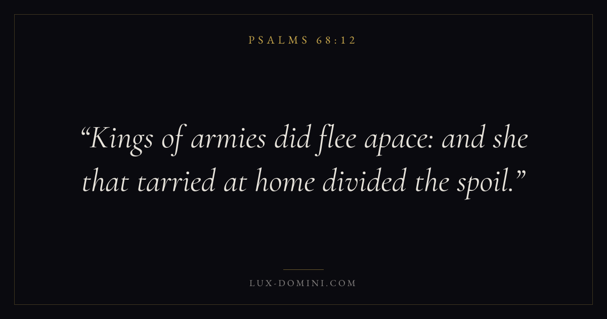 Books / Psalms / Chapter 68 / Verse 12 ← Psalms 68:11 Psalms 68:12 Psalms 68:13 → Kings of armies did flee apace: and she that tarried at home divided the spoil. Download verse card Share on Twitter Share on Facebook Pin it ✦ Key themes FaithPrayerPraiseLament Read with Hebrews 11:1Romans 10:17Matthew 6:9Luke 18:1 Related topics Bible verses about faithBible verses about prayerBible verses about thankfulness and gratitudeBible verses about grief and loss ✦ Psalms Chapter 68 verses V. 1 V. 2 V. 3 V. 4 V. 5 V. 6 V. 7 V. 8 V. 9 V. 10 V. 11 V. 12 V. 13 V. 14 V. 15 V. 16 V. 17 V. 18 V. 19 V. 20 V. 21 V. 22 V. 23 V. 24 V. 25 V. 26 V. 27 V. 28 V. 29 V. 30 V. 31 V. 32 V. 33 V. 34 V. 35