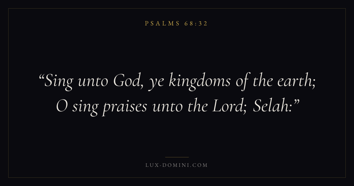 Books / Psalms / Chapter 68 / Verse 32 ← Psalms 68:31 Psalms 68:32 Psalms 68:33 → Sing unto God, ye kingdoms of the earth; O sing praises unto the Lord; Selah: Download verse card Share on Twitter Share on Facebook Pin it ✦ Key themes FaithPrayerPraiseLament Read with Hebrews 11:1Romans 10:17Matthew 6:9Luke 18:1 Related topics Bible verses about faithBible verses about prayerBible verses about thankfulness and gratitudeBible verses about grief and loss ✦ Psalms Chapter 68 verses V. 1 V. 2 V. 3 V. 4 V. 5 V. 6 V. 7 V. 8 V. 9 V. 10 V. 11 V. 12 V. 13 V. 14 V. 15 V. 16 V. 17 V. 18 V. 19 V. 20 V. 21 V. 22 V. 23 V. 24 V. 25 V. 26 V. 27 V. 28 V. 29 V. 30 V. 31 V. 32 V. 33 V. 34 V. 35