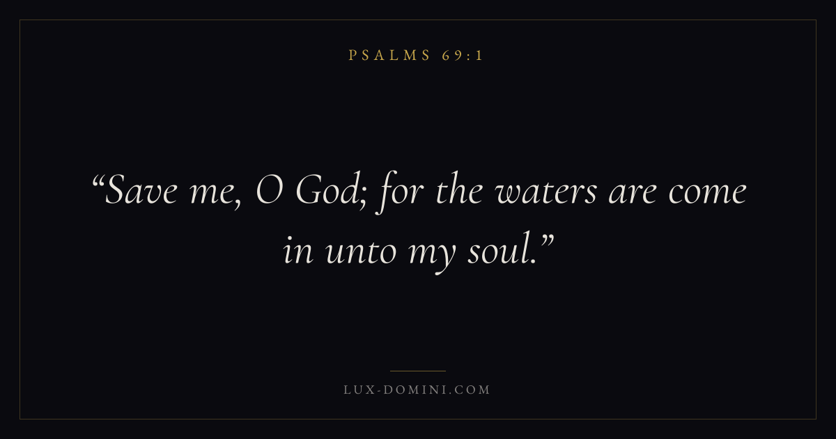 Books / Psalms / Chapter 69 / Verse 1 ← Psalms 68:35 Psalms 69:1 Psalms 69:2 → Save me, O God; for the waters are come in unto my soul. Download verse card Share on Twitter Share on Facebook Pin it ✦ Key themes LoveFaithPrayerSalvationPraise Read with John 3:161 Corinthians 13:4Hebrews 11:1Romans 10:17 Related topics Bible verses about loveBible verses about faithBible verses about prayerBible verses about salvationBible verses about thankfulness and gratitude ✦ Psalms Chapter 69 verses V. 1 V. 2 V. 3 V. 4 V. 5 V. 6 V. 7 V. 8 V. 9 V. 10 V. 11 V. 12 V. 13 V. 14 V. 15 V. 16 V. 17 V. 18 V. 19 V. 20 V. 21 V. 22 V. 23 V. 24 V. 25 V. 26 V. 27 V. 28 V. 29 V. 30 V. 31 V. 32 V. 33 V. 34 V. 35 V. 36