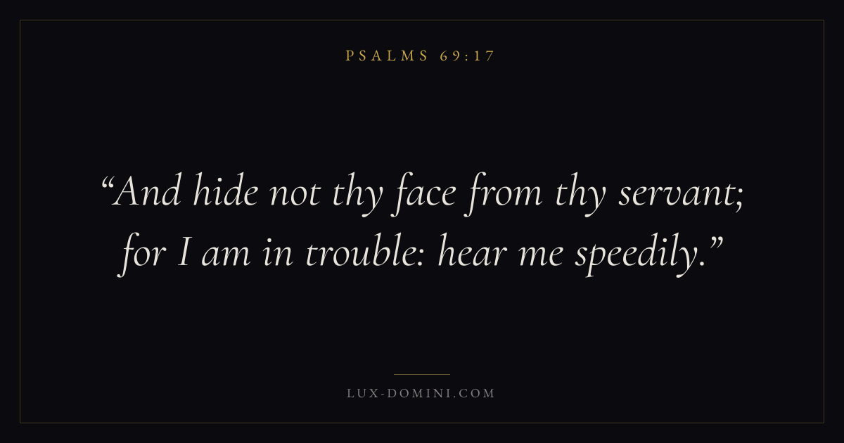 Books / Psalms / Chapter 69 / Verse 17 ← Psalms 69:16 Psalms 69:17 Psalms 69:18 → And hide not thy face from thy servant; for I am in trouble: hear me speedily. Download verse card Share on Twitter Share on Facebook Pin it ✦ Key themes FaithSuffering and trialsPrayerSalvationPraise Read with Hebrews 11:1Romans 10:17Romans 8:182 Corinthians 4:17 Related topics Bible verses about faithBible verses about suffering and trialsBible verses about prayerBible verses about salvationBible verses about thankfulness and gratitude ✦ Psalms Chapter 69 verses V. 1 V. 2 V. 3 V. 4 V. 5 V. 6 V. 7 V. 8 V. 9 V. 10 V. 11 V. 12 V. 13 V. 14 V. 15 V. 16 V. 17 V. 18 V. 19 V. 20 V. 21 V. 22 V. 23 V. 24 V. 25 V. 26 V. 27 V. 28 V. 29 V. 30 V. 31 V. 32 V. 33 V. 34 V. 35 V. 36