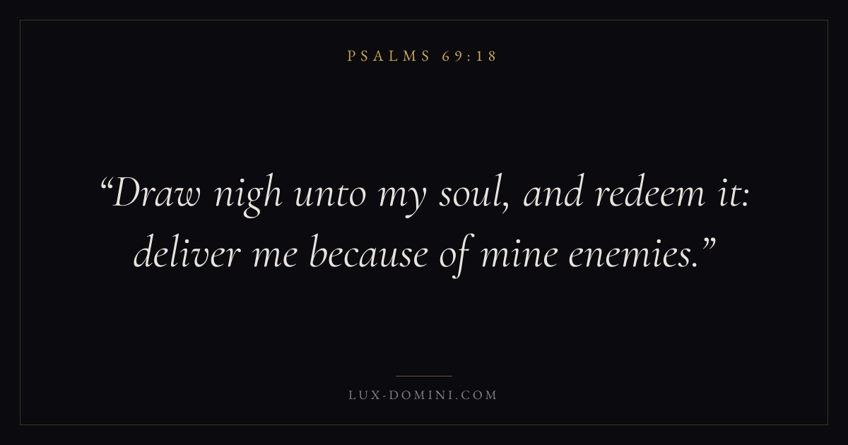 Books / Psalms / Chapter 69 / Verse 18 ← Psalms 69:17 Psalms 69:18 Psalms 69:19 → Draw nigh unto my soul, and redeem it: deliver me because of mine enemies. Download verse card Share on Twitter Share on Facebook Pin it ✦ Key themes FaithSuffering and trialsPrayerSalvationPraise Read with Hebrews 11:1Romans 10:17Romans 8:182 Corinthians 4:17 Related topics Bible verses about faithBible verses about suffering and trialsBible verses about prayerBible verses about salvationBible verses about thankfulness and gratitude ✦ Psalms Chapter 69 verses V. 1 V. 2 V. 3 V. 4 V. 5 V. 6 V. 7 V. 8 V. 9 V. 10 V. 11 V. 12 V. 13 V. 14 V. 15 V. 16 V. 17 V. 18 V. 19 V. 20 V. 21 V. 22 V. 23 V. 24 V. 25 V. 26 V. 27 V. 28 V. 29 V. 30 V. 31 V. 32 V. 33 V. 34 V. 35 V. 36