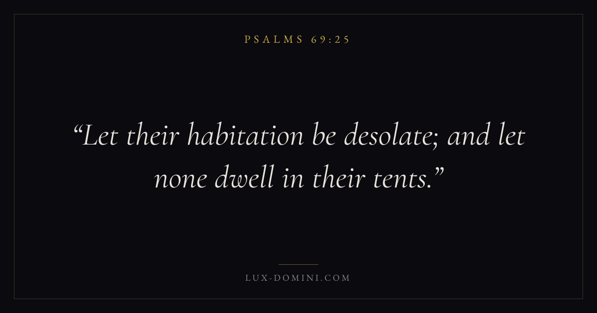 Books / Psalms / Chapter 69 / Verse 25 ← Psalms 69:24 Psalms 69:25 Psalms 69:26 → Let their habitation be desolate; and let none dwell in their tents. Download verse card Share on Twitter Share on Facebook Pin it ✦ Key themes FaithPrayerPraiseLament Read with Hebrews 11:1Romans 10:17Matthew 6:9Luke 18:1 Related topics Bible verses about faithBible verses about prayerBible verses about thankfulness and gratitudeBible verses about grief and loss ✦ Psalms Chapter 69 verses V. 1 V. 2 V. 3 V. 4 V. 5 V. 6 V. 7 V. 8 V. 9 V. 10 V. 11 V. 12 V. 13 V. 14 V. 15 V. 16 V. 17 V. 18 V. 19 V. 20 V. 21 V. 22 V. 23 V. 24 V. 25 V. 26 V. 27 V. 28 V. 29 V. 30 V. 31 V. 32 V. 33 V. 34 V. 35 V. 36