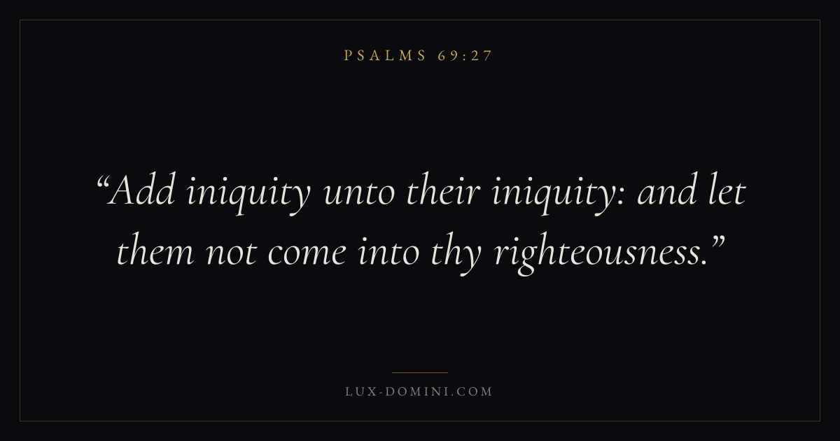 Books / Psalms / Chapter 69 / Verse 27 ← Psalms 69:26 Psalms 69:27 Psalms 69:28 → Add iniquity unto their iniquity: and let them not come into thy righteousness. Download verse card Share on Twitter Share on Facebook Pin it ✦ Key themes FaithPrayerPraiseLament Read with Hebrews 11:1Romans 10:17Matthew 6:9Luke 18:1 Related topics Bible verses about faithBible verses about prayerBible verses about thankfulness and gratitudeBible verses about grief and loss ✦ Psalms Chapter 69 verses V. 1 V. 2 V. 3 V. 4 V. 5 V. 6 V. 7 V. 8 V. 9 V. 10 V. 11 V. 12 V. 13 V. 14 V. 15 V. 16 V. 17 V. 18 V. 19 V. 20 V. 21 V. 22 V. 23 V. 24 V. 25 V. 26 V. 27 V. 28 V. 29 V. 30 V. 31 V. 32 V. 33 V. 34 V. 35 V. 36