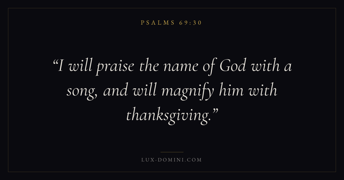 Books / Psalms / Chapter 69 / Verse 30 ← Psalms 69:29 Psalms 69:30 Psalms 69:31 → I will praise the name of God with a song, and will magnify him with thanksgiving. Download verse card Share on Twitter Share on Facebook Pin it ✦ Key themes FaithSuffering and trialsPrayerHumilityPraise Read with Hebrews 11:1Romans 10:17Romans 8:182 Corinthians 4:17 Related topics Bible verses about faithBible verses about suffering and trialsBible verses about prayerBible verses about humilityBible verses about thankfulness and gratitude ✦ Psalms Chapter 69 verses V. 1 V. 2 V. 3 V. 4 V. 5 V. 6 V. 7 V. 8 V. 9 V. 10 V. 11 V. 12 V. 13 V. 14 V. 15 V. 16 V. 17 V. 18 V. 19 V. 20 V. 21 V. 22 V. 23 V. 24 V. 25 V. 26 V. 27 V. 28 V. 29 V. 30 V. 31 V. 32 V. 33 V. 34 V. 35 V. 36