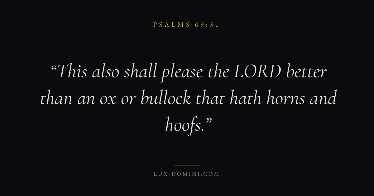 Books / Psalms / Chapter 69 / Verse 31 ← Psalms 69:30 Psalms 69:31 Psalms 69:32 → This also shall please the LORD better than an ox or bullock that hath horns and hoofs. Download verse card Share on Twitter Share on Facebook Pin it ✦ Key themes FaithSuffering and trialsPrayerHumilityPraise Read with Hebrews 11:1Romans 10:17Romans 8:182 Corinthians 4:17 Related topics Bible verses about faithBible verses about suffering and trialsBible verses about prayerBible verses about humilityBible verses about thankfulness and gratitude ✦ Psalms Chapter 69 verses V. 1 V. 2 V. 3 V. 4 V. 5 V. 6 V. 7 V. 8 V. 9 V. 10 V. 11 V. 12 V. 13 V. 14 V. 15 V. 16 V. 17 V. 18 V. 19 V. 20 V. 21 V. 22 V. 23 V. 24 V. 25 V. 26 V. 27 V. 28 V. 29 V. 30 V. 31 V. 32 V. 33 V. 34 V. 35 V. 36