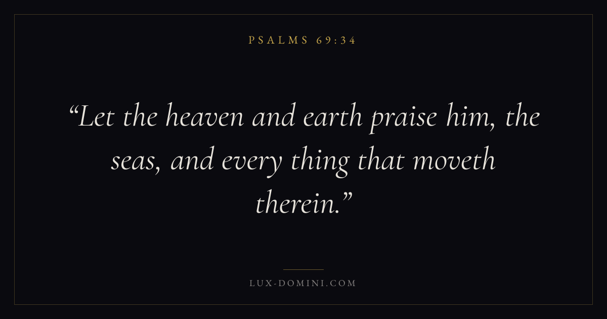Books / Psalms / Chapter 69 / Verse 34 ← Psalms 69:33 Psalms 69:34 Psalms 69:35 → Let the heaven and earth praise him, the seas, and every thing that moveth therein. Download verse card Share on Twitter Share on Facebook Pin it ✦ Key themes FaithSuffering and trialsPrayerHumilityPraise Read with Hebrews 11:1Romans 10:17Romans 8:182 Corinthians 4:17 Related topics Bible verses about faithBible verses about suffering and trialsBible verses about prayerBible verses about humilityBible verses about thankfulness and gratitude ✦ Psalms Chapter 69 verses V. 1 V. 2 V. 3 V. 4 V. 5 V. 6 V. 7 V. 8 V. 9 V. 10 V. 11 V. 12 V. 13 V. 14 V. 15 V. 16 V. 17 V. 18 V. 19 V. 20 V. 21 V. 22 V. 23 V. 24 V. 25 V. 26 V. 27 V. 28 V. 29 V. 30 V. 31 V. 32 V. 33 V. 34 V. 35 V. 36