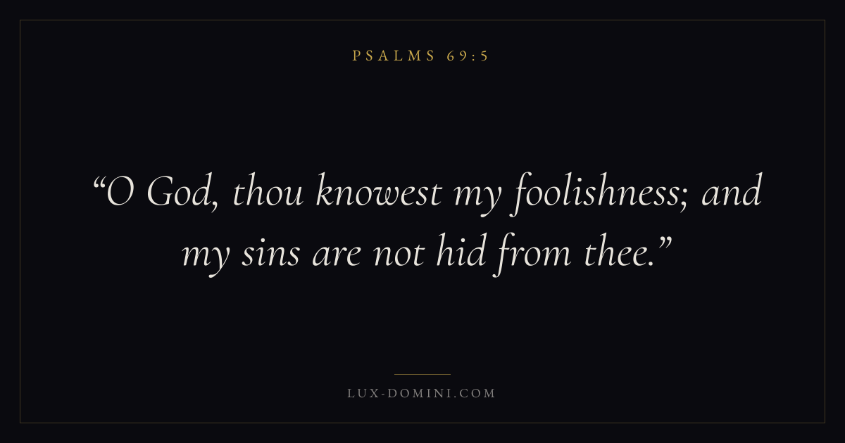 Books / Psalms / Chapter 69 / Verse 5 ← Psalms 69:4 Psalms 69:5 Psalms 69:6 → O God, thou knowest my foolishness; and my sins are not hid from thee. Download verse card Share on Twitter Share on Facebook Pin it ✦ Key themes LoveFaithPrayerSalvationPraise Read with John 3:161 Corinthians 13:4Hebrews 11:1Romans 10:17 Related topics Bible verses about loveBible verses about faithBible verses about prayerBible verses about salvationBible verses about thankfulness and gratitude ✦ Psalms Chapter 69 verses V. 1 V. 2 V. 3 V. 4 V. 5 V. 6 V. 7 V. 8 V. 9 V. 10 V. 11 V. 12 V. 13 V. 14 V. 15 V. 16 V. 17 V. 18 V. 19 V. 20 V. 21 V. 22 V. 23 V. 24 V. 25 V. 26 V. 27 V. 28 V. 29 V. 30 V. 31 V. 32 V. 33 V. 34 V. 35 V. 36
