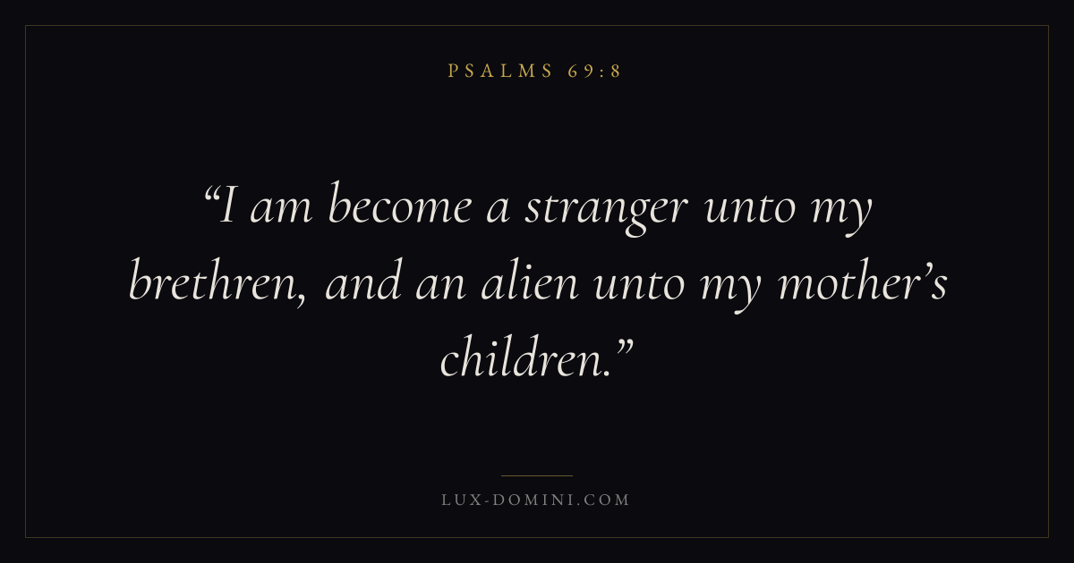 Books / Psalms / Chapter 69 / Verse 8 ← Psalms 69:7 Psalms 69:8 Psalms 69:9 → I am become a stranger unto my brethren, and an alien unto my mother’s children. Download verse card Share on Twitter Share on Facebook Pin it ✦ Key themes LoveFaithPrayerSalvationPraise Read with John 3:161 Corinthians 13:4Hebrews 11:1Romans 10:17 Related topics Bible verses about loveBible verses about faithBible verses about prayerBible verses about salvationBible verses about thankfulness and gratitude ✦ Psalms Chapter 69 verses V. 1 V. 2 V. 3 V. 4 V. 5 V. 6 V. 7 V. 8 V. 9 V. 10 V. 11 V. 12 V. 13 V. 14 V. 15 V. 16 V. 17 V. 18 V. 19 V. 20 V. 21 V. 22 V. 23 V. 24 V. 25 V. 26 V. 27 V. 28 V. 29 V. 30 V. 31 V. 32 V. 33 V. 34 V. 35 V. 36