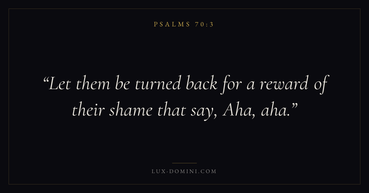 Books / Psalms / Chapter 70 / Verse 3 ← Psalms 70:2 Psalms 70:3 Psalms 70:4 → Let them be turned back for a reward of their shame that say, Aha, aha. Download verse card Share on Twitter Share on Facebook Pin it ✦ Key themes FaithPrayerPraiseLament Read with Hebrews 11:1Romans 10:17Matthew 6:9Luke 18:1 Related topics Bible verses about faithBible verses about prayerBible verses about thankfulness and gratitudeBible verses about grief and loss ✦ Psalms Chapter 70 verses V. 1 V. 2 V. 3 V. 4 V. 5