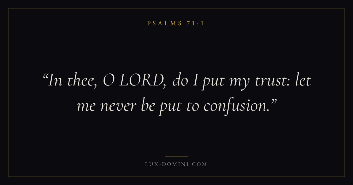 Books / Psalms / Chapter 71 / Verse 1 ← Psalms 70:5 Psalms 71:1 Psalms 71:2 → In thee, O LORD, do I put my trust: let me never be put to confusion. Download verse card Share on Twitter Share on Facebook Pin it ✦ Key themes FaithPrayerGraceTruthPraise Read with Hebrews 11:1Romans 10:17Matthew 6:9Luke 18:1 Related topics Bible verses about faithBible verses about prayerBible verses about graceBible verses about truthBible verses about thankfulness and gratitude ✦ Psalms Chapter 71 verses V. 1 V. 2 V. 3 V. 4 V. 5 V. 6 V. 7 V. 8 V. 9 V. 10 V. 11 V. 12 V. 13 V. 14 V. 15 V. 16 V. 17 V. 18 V. 19 V. 20 V. 21 V. 22 V. 23 V. 24