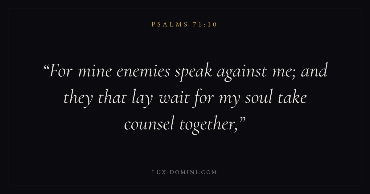 Books / Psalms / Chapter 71 / Verse 10 ← Psalms 71:9 Psalms 71:10 Psalms 71:11 → For mine enemies speak against me; and they that lay wait for my soul take counsel together, Download verse card Share on Twitter Share on Facebook Pin it ✦ Key themes FaithHopePrayerGracePraise Read with Hebrews 11:1Romans 10:17Romans 8:24Revelation 21:4 Related topics Bible verses about faithBible verses about hopeBible verses about prayerBible verses about graceBible verses about thankfulness and gratitude ✦ Psalms Chapter 71 verses V. 1 V. 2 V. 3 V. 4 V. 5 V. 6 V. 7 V. 8 V. 9 V. 10 V. 11 V. 12 V. 13 V. 14 V. 15 V. 16 V. 17 V. 18 V. 19 V. 20 V. 21 V. 22 V. 23 V. 24