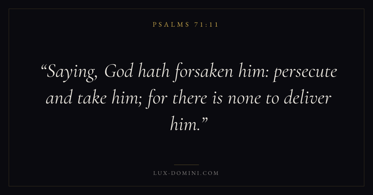 Books / Psalms / Chapter 71 / Verse 11 ← Psalms 71:10 Psalms 71:11 Psalms 71:12 → Saying, God hath forsaken him: persecute and take him; for there is none to deliver him. Download verse card Share on Twitter Share on Facebook Pin it ✦ Key themes FaithPrayerGraceTruthPraise Read with Hebrews 11:1Romans 10:17Matthew 6:9Luke 18:1 Related topics Bible verses about faithBible verses about prayerBible verses about graceBible verses about truthBible verses about thankfulness and gratitude ✦ Psalms Chapter 71 verses V. 1 V. 2 V. 3 V. 4 V. 5 V. 6 V. 7 V. 8 V. 9 V. 10 V. 11 V. 12 V. 13 V. 14 V. 15 V. 16 V. 17 V. 18 V. 19 V. 20 V. 21 V. 22 V. 23 V. 24