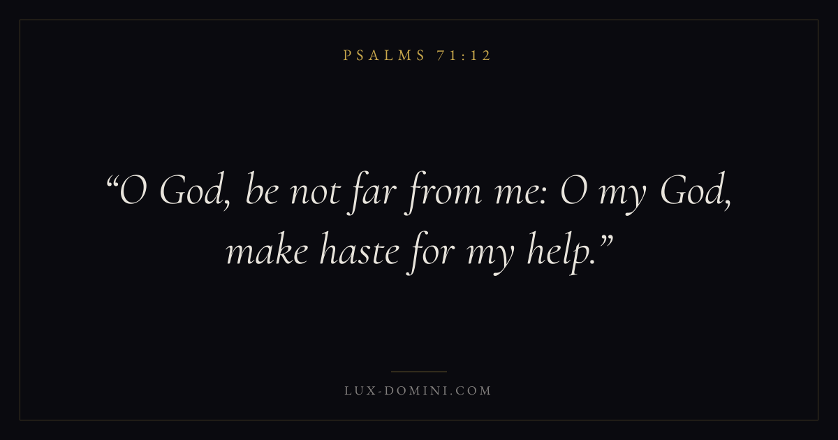 Books / Psalms / Chapter 71 / Verse 12 ← Psalms 71:11 Psalms 71:12 Psalms 71:13 → O God, be not far from me: O my God, make haste for my help. Download verse card Share on Twitter Share on Facebook Pin it ✦ Key themes FaithPrayerGraceTruthPraise Read with Hebrews 11:1Romans 10:17Matthew 6:9Luke 18:1 Related topics Bible verses about faithBible verses about prayerBible verses about graceBible verses about truthBible verses about thankfulness and gratitude ✦ Psalms Chapter 71 verses V. 1 V. 2 V. 3 V. 4 V. 5 V. 6 V. 7 V. 8 V. 9 V. 10 V. 11 V. 12 V. 13 V. 14 V. 15 V. 16 V. 17 V. 18 V. 19 V. 20 V. 21 V. 22 V. 23 V. 24