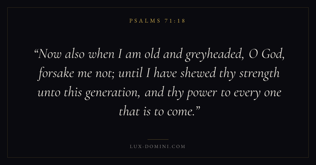 Now also when I am old and greyheaded, O God, forsake me not; until I have shewed thy strength unto this generation, and thy power to every one that is to come.
