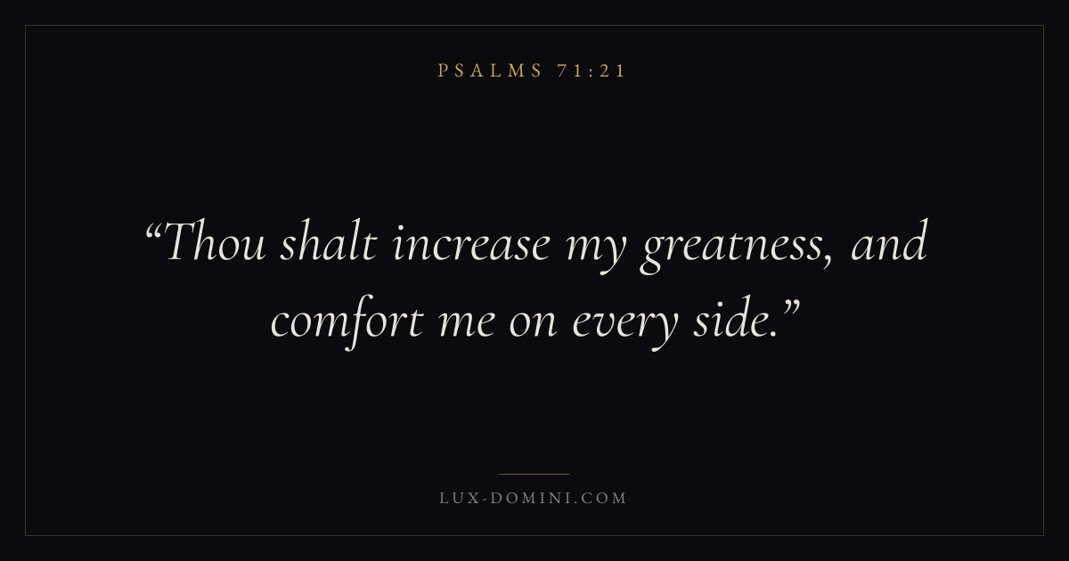 Books / Psalms / Chapter 71 / Verse 21 ← Psalms 71:20 Psalms 71:21 Psalms 71:22 → Thou shalt increase my greatness, and comfort me on every side. Download verse card Share on Twitter Share on Facebook Pin it ✦ Key themes FaithPrayerSalvationPraise Read with Hebrews 11:1Romans 10:17Matthew 6:9Luke 18:1 Related topics Bible verses about faithBible verses about prayerBible verses about salvationBible verses about thankfulness and gratitude ✦ Psalms Chapter 71 verses V. 1 V. 2 V. 3 V. 4 V. 5 V. 6 V. 7 V. 8 V. 9 V. 10 V. 11 V. 12 V. 13 V. 14 V. 15 V. 16 V. 17 V. 18 V. 19 V. 20 V. 21 V. 22 V. 23 V. 24