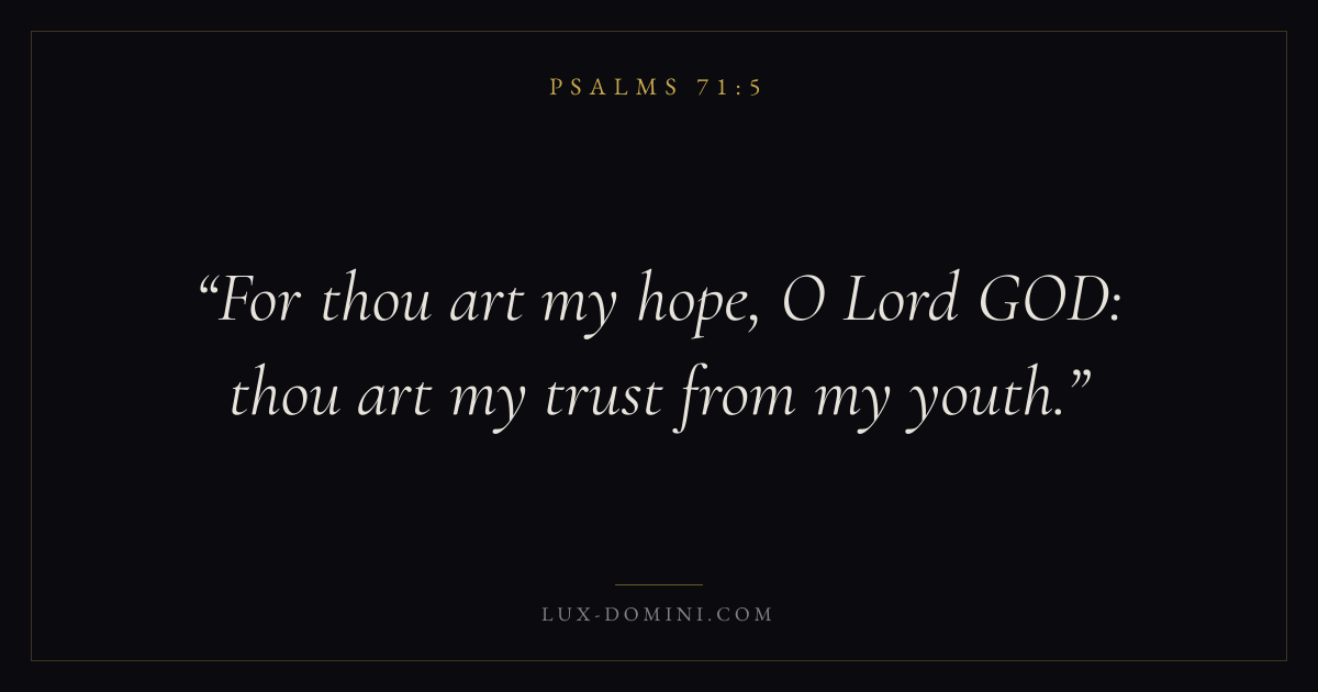 Books / Psalms / Chapter 71 / Verse 5 ← Psalms 71:4 Psalms 71:5 Psalms 71:6 → For thou art my hope, O Lord GOD: thou art my trust from my youth. Download verse card Share on Twitter Share on Facebook Pin it ✦ Key themes FaithHopePrayerGracePraise Read with Hebrews 11:1Romans 10:17Romans 8:24Revelation 21:4 Related topics Bible verses about faithBible verses about hopeBible verses about prayerBible verses about graceBible verses about thankfulness and gratitude ✦ Psalms Chapter 71 verses V. 1 V. 2 V. 3 V. 4 V. 5 V. 6 V. 7 V. 8 V. 9 V. 10 V. 11 V. 12 V. 13 V. 14 V. 15 V. 16 V. 17 V. 18 V. 19 V. 20 V. 21 V. 22 V. 23 V. 24