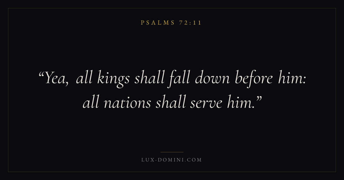 Books / Psalms / Chapter 72 / Verse 11 ← Psalms 72:10 Psalms 72:11 Psalms 72:12 → Yea, all kings shall fall down before him: all nations shall serve him. Download verse card Share on Twitter Share on Facebook Pin it ✦ Key themes FaithPrayerPeacePraise Read with Hebrews 11:1Romans 10:17Matthew 6:9Luke 18:1 Related topics Bible verses about faithBible verses about prayerBible verses about peaceBible verses about thankfulness and gratitude ✦ Psalms Chapter 72 verses V. 1 V. 2 V. 3 V. 4 V. 5 V. 6 V. 7 V. 8 V. 9 V. 10 V. 11 V. 12 V. 13 V. 14 V. 15 V. 16 V. 17 V. 18 V. 19 V. 20