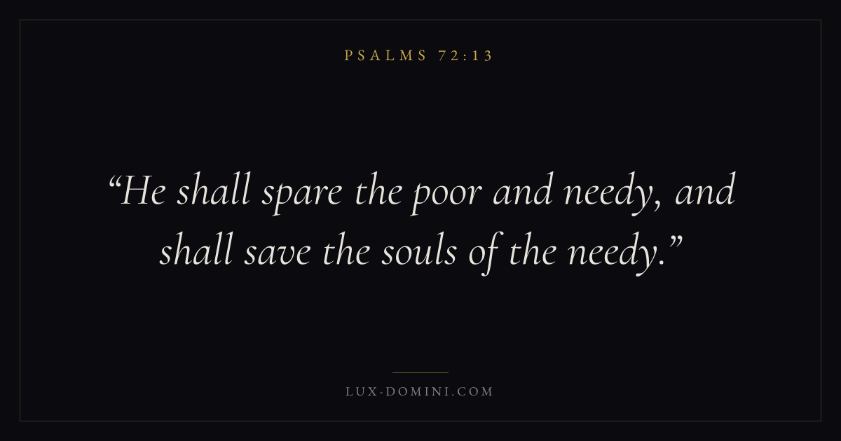 Books / Psalms / Chapter 72 / Verse 13 ← Psalms 72:12 Psalms 72:13 Psalms 72:14 → He shall spare the poor and needy, and shall save the souls of the needy. Download verse card Share on Twitter Share on Facebook Pin it ✦ Key themes FaithPrayerJustice and mercySalvationPraise Read with Hebrews 11:1Romans 10:17Matthew 6:9Luke 18:1 Related topics Bible verses about faithBible verses about prayerBible verses about justice and mercyBible verses about salvationBible verses about thankfulness and gratitude ✦ Psalms Chapter 72 verses V. 1 V. 2 V. 3 V. 4 V. 5 V. 6 V. 7 V. 8 V. 9 V. 10 V. 11 V. 12 V. 13 V. 14 V. 15 V. 16 V. 17 V. 18 V. 19 V. 20