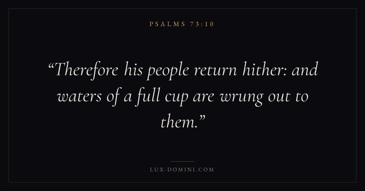 Books / Psalms / Chapter 73 / Verse 10 ← Psalms 73:9 Psalms 73:10 Psalms 73:11 → Therefore his people return hither: and waters of a full cup are wrung out to them. Download verse card Share on Twitter Share on Facebook Pin it ✦ Key themes FaithPrayerPraiseLament Read with Hebrews 11:1Romans 10:17Matthew 6:9Luke 18:1 Related topics Bible verses about faithBible verses about prayerBible verses about thankfulness and gratitudeBible verses about grief and loss ✦ Psalms Chapter 73 verses V. 1 V. 2 V. 3 V. 4 V. 5 V. 6 V. 7 V. 8 V. 9 V. 10 V. 11 V. 12 V. 13 V. 14 V. 15 V. 16 V. 17 V. 18 V. 19 V. 20 V. 21 V. 22 V. 23 V. 24 V. 25 V. 26 V. 27 V. 28