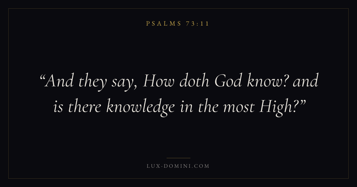 Books / Psalms / Chapter 73 / Verse 11 ← Psalms 73:10 Psalms 73:11 Psalms 73:12 → And they say, How doth God know? and is there knowledge in the most High? Download verse card Share on Twitter Share on Facebook Pin it ✦ Key themes FaithPrayerWisdomPraise Read with Hebrews 11:1Romans 10:17Matthew 6:9Luke 18:1 Related topics Bible verses about faithBible verses about prayerBible verses about wisdomBible verses about thankfulness and gratitude ✦ Psalms Chapter 73 verses V. 1 V. 2 V. 3 V. 4 V. 5 V. 6 V. 7 V. 8 V. 9 V. 10 V. 11 V. 12 V. 13 V. 14 V. 15 V. 16 V. 17 V. 18 V. 19 V. 20 V. 21 V. 22 V. 23 V. 24 V. 25 V. 26 V. 27 V. 28
