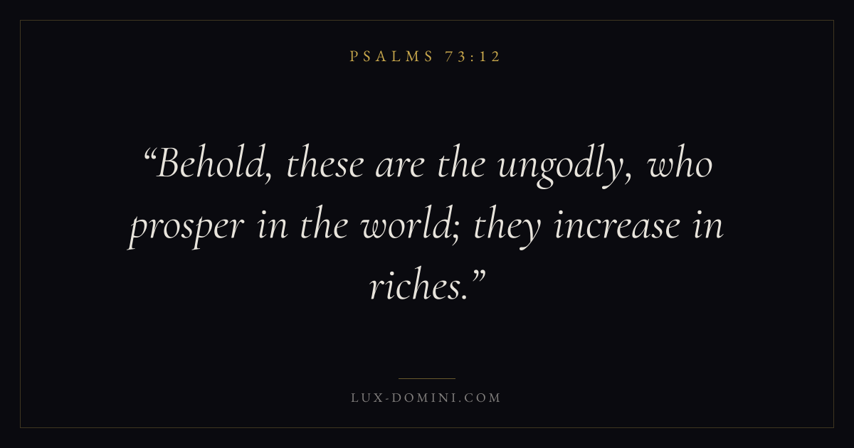 Books / Psalms / Chapter 73 / Verse 12 ← Psalms 73:11 Psalms 73:12 Psalms 73:13 → Behold, these are the ungodly, who prosper in the world; they increase in riches. Download verse card Share on Twitter Share on Facebook Pin it ✦ Key themes FaithPrayerPraiseLament Read with Hebrews 11:1Romans 10:17Matthew 6:9Luke 18:1 Related topics Bible verses about faithBible verses about prayerBible verses about thankfulness and gratitudeBible verses about grief and loss ✦ Psalms Chapter 73 verses V. 1 V. 2 V. 3 V. 4 V. 5 V. 6 V. 7 V. 8 V. 9 V. 10 V. 11 V. 12 V. 13 V. 14 V. 15 V. 16 V. 17 V. 18 V. 19 V. 20 V. 21 V. 22 V. 23 V. 24 V. 25 V. 26 V. 27 V. 28
