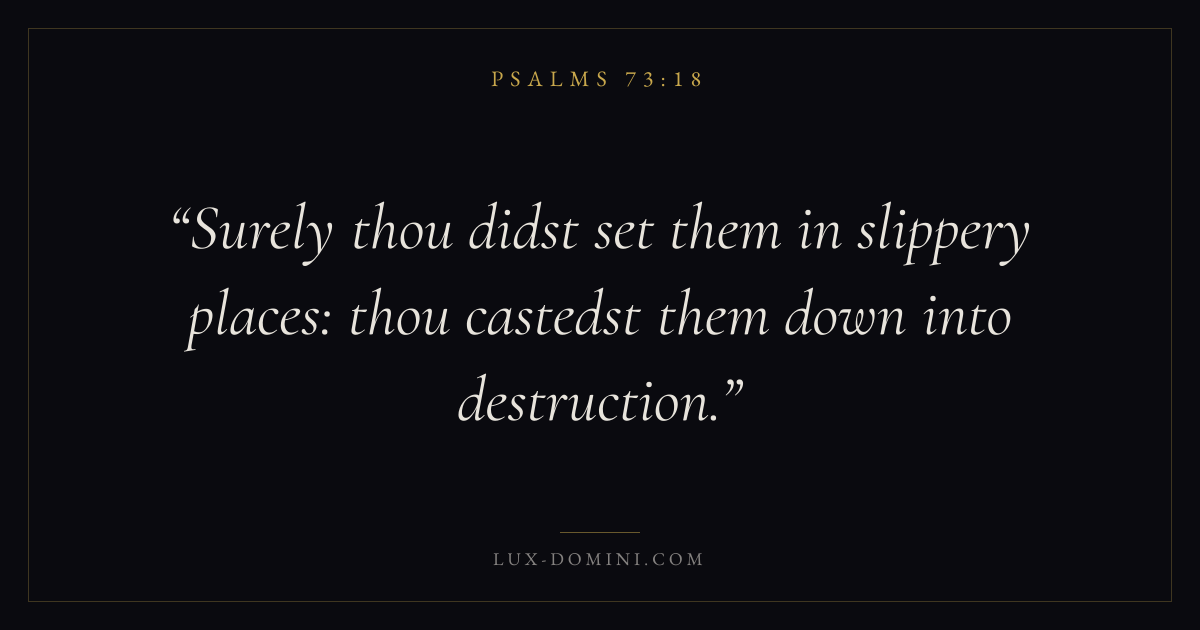 Books / Psalms / Chapter 73 / Verse 18 ← Psalms 73:17 Psalms 73:18 Psalms 73:19 → Surely thou didst set them in slippery places: thou castedst them down into destruction. Download verse card Share on Twitter Share on Facebook Pin it ✦ Key themes FaithPrayerGracePraise Read with Hebrews 11:1Romans 10:17Matthew 6:9Luke 18:1 Related topics Bible verses about faithBible verses about prayerBible verses about graceBible verses about thankfulness and gratitude ✦ Psalms Chapter 73 verses V. 1 V. 2 V. 3 V. 4 V. 5 V. 6 V. 7 V. 8 V. 9 V. 10 V. 11 V. 12 V. 13 V. 14 V. 15 V. 16 V. 17 V. 18 V. 19 V. 20 V. 21 V. 22 V. 23 V. 24 V. 25 V. 26 V. 27 V. 28