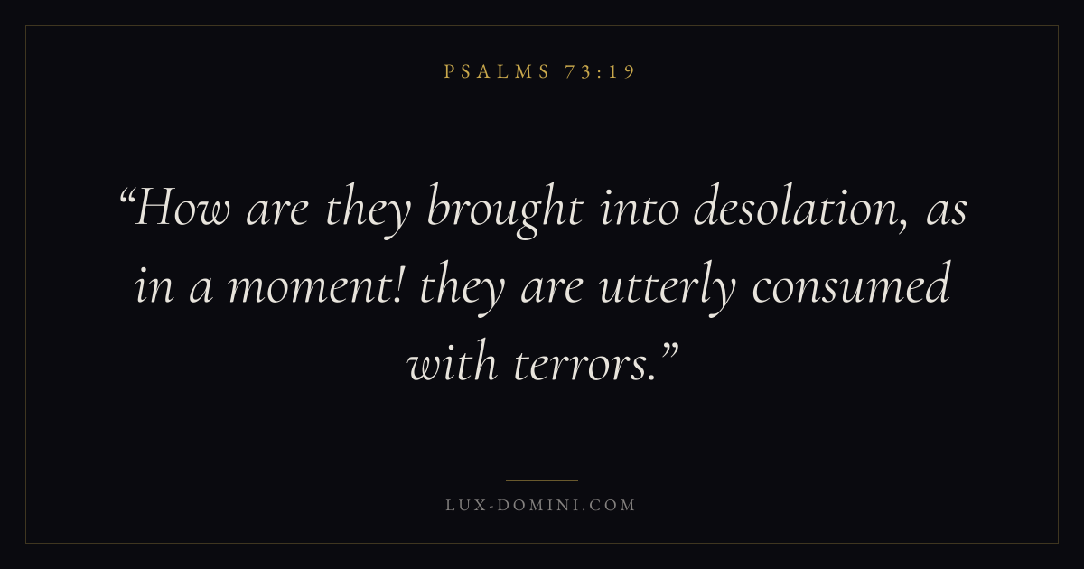 Books / Psalms / Chapter 73 / Verse 19 ← Psalms 73:18 Psalms 73:19 Psalms 73:20 → How are they brought into desolation, as in a moment! they are utterly consumed with terrors. Download verse card Share on Twitter Share on Facebook Pin it ✦ Key themes FaithPrayerGracePraise Read with Hebrews 11:1Romans 10:17Matthew 6:9Luke 18:1 Related topics Bible verses about faithBible verses about prayerBible verses about graceBible verses about thankfulness and gratitude ✦ Psalms Chapter 73 verses V. 1 V. 2 V. 3 V. 4 V. 5 V. 6 V. 7 V. 8 V. 9 V. 10 V. 11 V. 12 V. 13 V. 14 V. 15 V. 16 V. 17 V. 18 V. 19 V. 20 V. 21 V. 22 V. 23 V. 24 V. 25 V. 26 V. 27 V. 28