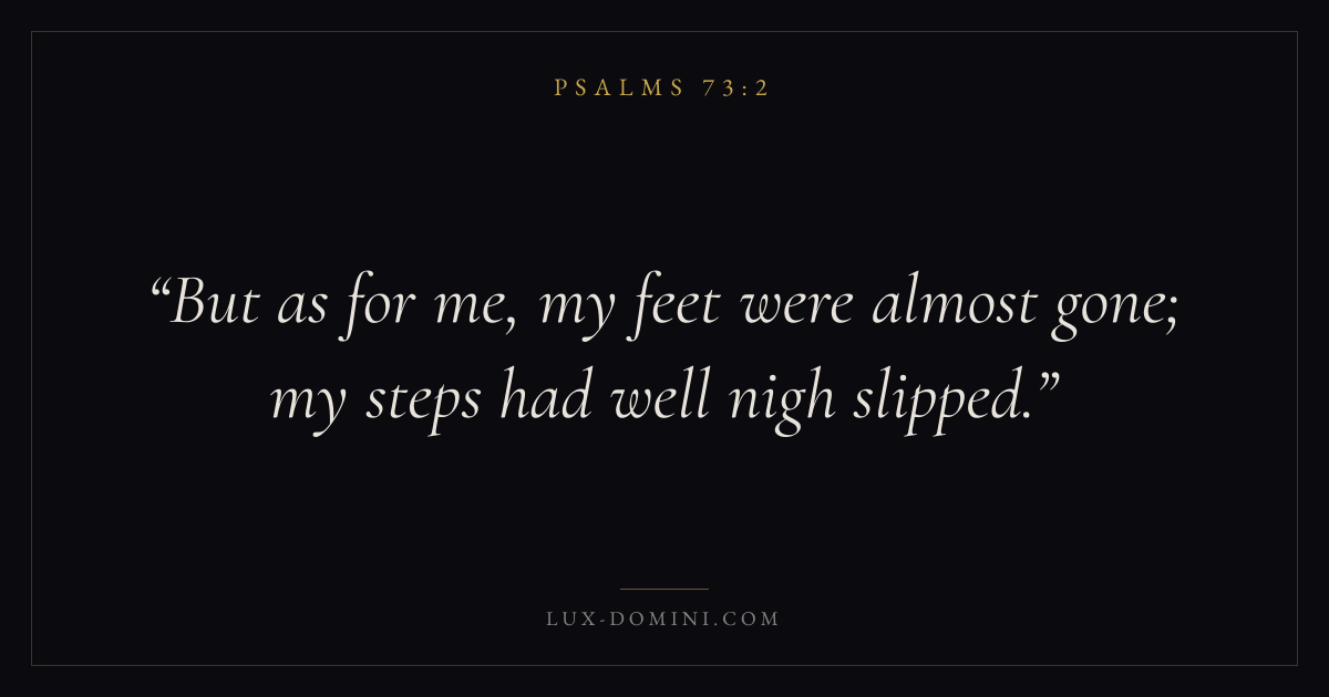 Books / Psalms / Chapter 73 / Verse 2 ← Psalms 73:1 Psalms 73:2 Psalms 73:3 → But as for me, my feet were almost gone; my steps had well nigh slipped. Download verse card Share on Twitter Share on Facebook Pin it ✦ Key themes FaithPrayerPraiseLament Read with Hebrews 11:1Romans 10:17Matthew 6:9Luke 18:1 Related topics Bible verses about faithBible verses about prayerBible verses about thankfulness and gratitudeBible verses about grief and loss ✦ Psalms Chapter 73 verses V. 1 V. 2 V. 3 V. 4 V. 5 V. 6 V. 7 V. 8 V. 9 V. 10 V. 11 V. 12 V. 13 V. 14 V. 15 V. 16 V. 17 V. 18 V. 19 V. 20 V. 21 V. 22 V. 23 V. 24 V. 25 V. 26 V. 27 V. 28