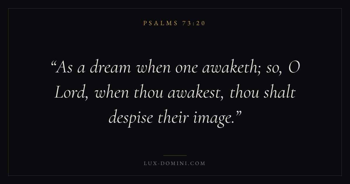 Books / Psalms / Chapter 73 / Verse 20 ← Psalms 73:19 Psalms 73:20 Psalms 73:21 → As a dream when one awaketh; so, O Lord, when thou awakest, thou shalt despise their image. Download verse card Share on Twitter Share on Facebook Pin it ✦ Key themes FaithPrayerGracePraise Read with Hebrews 11:1Romans 10:17Matthew 6:9Luke 18:1 Related topics Bible verses about faithBible verses about prayerBible verses about graceBible verses about thankfulness and gratitude ✦ Psalms Chapter 73 verses V. 1 V. 2 V. 3 V. 4 V. 5 V. 6 V. 7 V. 8 V. 9 V. 10 V. 11 V. 12 V. 13 V. 14 V. 15 V. 16 V. 17 V. 18 V. 19 V. 20 V. 21 V. 22 V. 23 V. 24 V. 25 V. 26 V. 27 V. 28