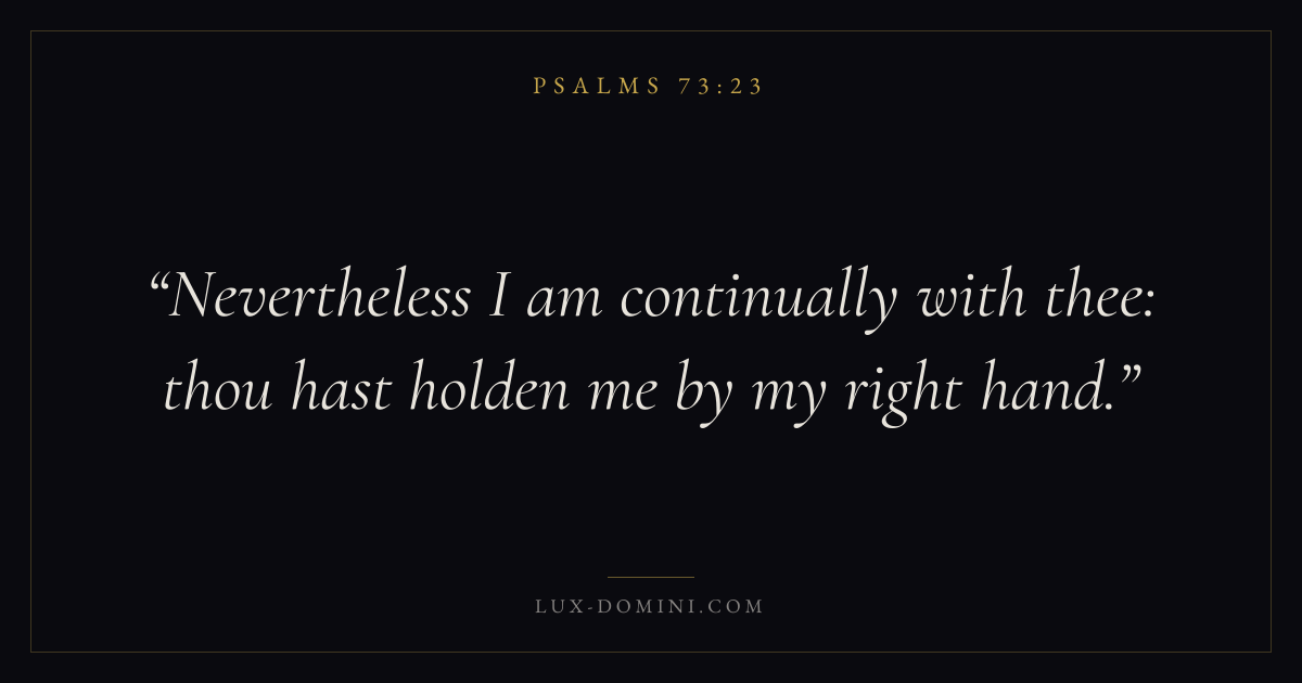 Books / Psalms / Chapter 73 / Verse 23 ← Psalms 73:22 Psalms 73:23 Psalms 73:24 → Nevertheless I am continually with thee: thou hast holden me by my right hand. Download verse card Share on Twitter Share on Facebook Pin it ✦ Key themes FaithSuffering and trialsPrayerSalvationPraise Read with Hebrews 11:1Romans 10:17Romans 8:182 Corinthians 4:17 Related topics Bible verses about faithBible verses about suffering and trialsBible verses about prayerBible verses about salvationBible verses about thankfulness and gratitude ✦ Psalms Chapter 73 verses V. 1 V. 2 V. 3 V. 4 V. 5 V. 6 V. 7 V. 8 V. 9 V. 10 V. 11 V. 12 V. 13 V. 14 V. 15 V. 16 V. 17 V. 18 V. 19 V. 20 V. 21 V. 22 V. 23 V. 24 V. 25 V. 26 V. 27 V. 28