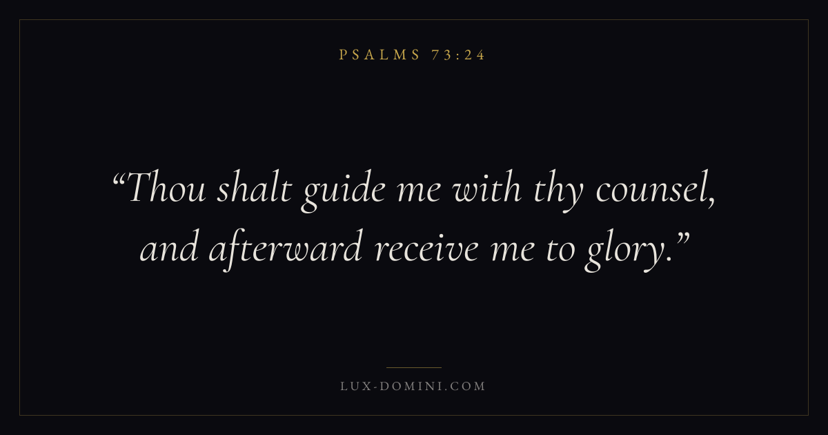 Books / Psalms / Chapter 73 / Verse 24 ← Psalms 73:23 Psalms 73:24 Psalms 73:25 → Thou shalt guide me with thy counsel, and afterward receive me to glory. Download verse card Share on Twitter Share on Facebook Pin it ✦ Key themes FaithSuffering and trialsPrayerSalvationPraise Read with Hebrews 11:1Romans 10:17Romans 8:182 Corinthians 4:17 Related topics Bible verses about faithBible verses about suffering and trialsBible verses about prayerBible verses about salvationBible verses about thankfulness and gratitude ✦ Psalms Chapter 73 verses V. 1 V. 2 V. 3 V. 4 V. 5 V. 6 V. 7 V. 8 V. 9 V. 10 V. 11 V. 12 V. 13 V. 14 V. 15 V. 16 V. 17 V. 18 V. 19 V. 20 V. 21 V. 22 V. 23 V. 24 V. 25 V. 26 V. 27 V. 28