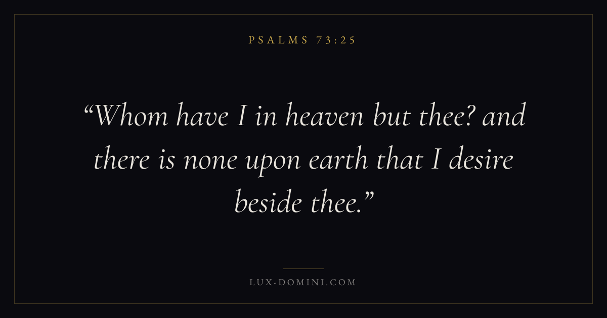 Books / Psalms / Chapter 73 / Verse 25 ← Psalms 73:24 Psalms 73:25 Psalms 73:26 → Whom have I in heaven but thee? and there is none upon earth that I desire beside thee. Download verse card Share on Twitter Share on Facebook Pin it ✦ Key themes FaithSuffering and trialsPrayerSalvationPraise Read with Hebrews 11:1Romans 10:17Romans 8:182 Corinthians 4:17 Related topics Bible verses about faithBible verses about suffering and trialsBible verses about prayerBible verses about salvationBible verses about thankfulness and gratitude ✦ Psalms Chapter 73 verses V. 1 V. 2 V. 3 V. 4 V. 5 V. 6 V. 7 V. 8 V. 9 V. 10 V. 11 V. 12 V. 13 V. 14 V. 15 V. 16 V. 17 V. 18 V. 19 V. 20 V. 21 V. 22 V. 23 V. 24 V. 25 V. 26 V. 27 V. 28