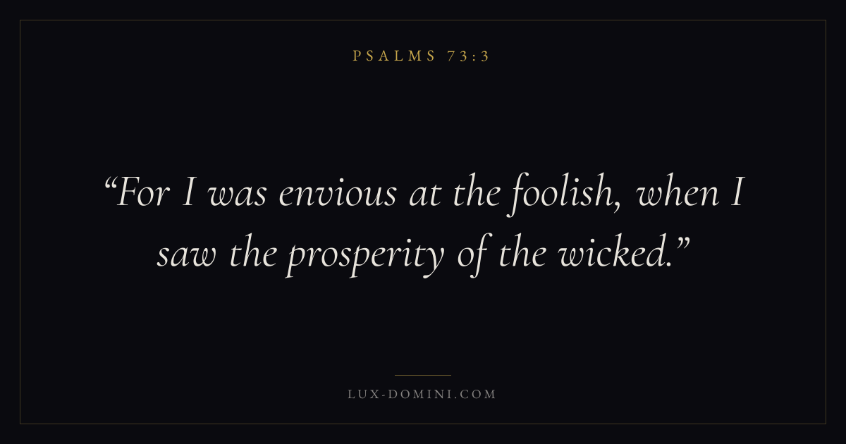 Books / Psalms / Chapter 73 / Verse 3 ← Psalms 73:2 Psalms 73:3 Psalms 73:4 → For I was envious at the foolish, when I saw the prosperity of the wicked. Download verse card Share on Twitter Share on Facebook Pin it ✦ Key themes FaithPrayerPraiseLament Read with Hebrews 11:1Romans 10:17Matthew 6:9Luke 18:1 Related topics Bible verses about faithBible verses about prayerBible verses about thankfulness and gratitudeBible verses about grief and loss ✦ Psalms Chapter 73 verses V. 1 V. 2 V. 3 V. 4 V. 5 V. 6 V. 7 V. 8 V. 9 V. 10 V. 11 V. 12 V. 13 V. 14 V. 15 V. 16 V. 17 V. 18 V. 19 V. 20 V. 21 V. 22 V. 23 V. 24 V. 25 V. 26 V. 27 V. 28