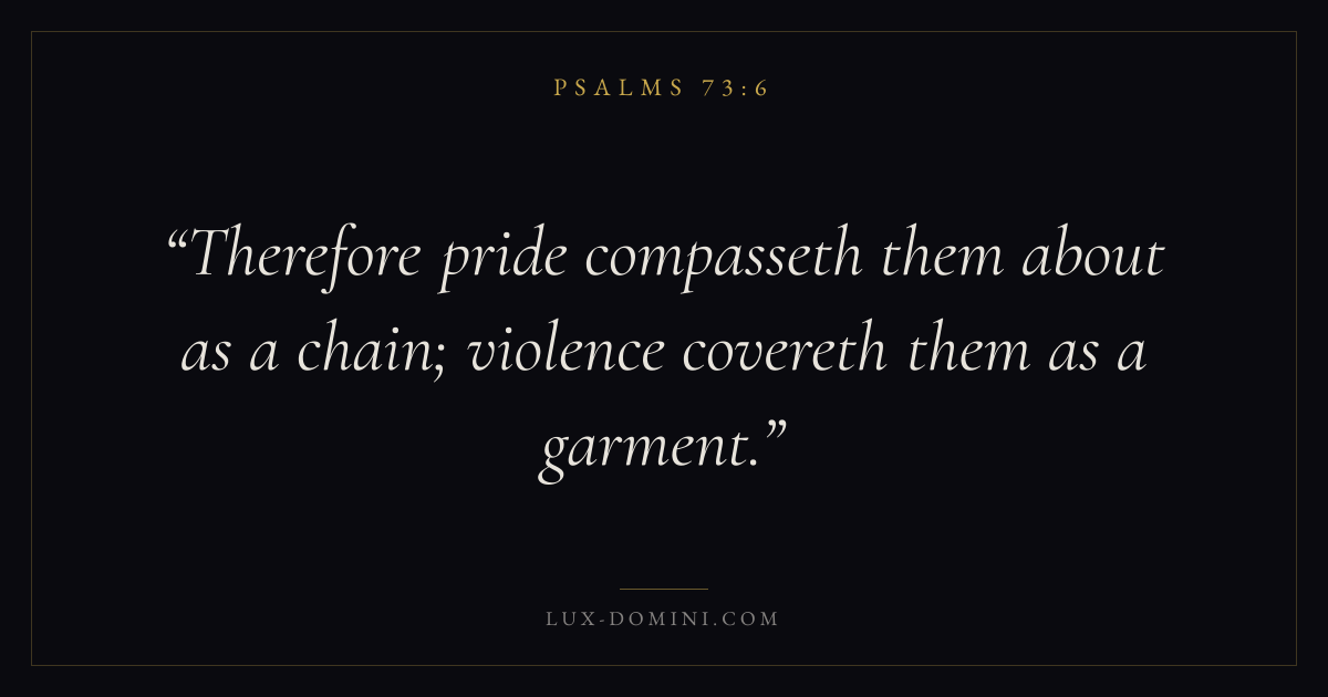 Books / Psalms / Chapter 73 / Verse 6 ← Psalms 73:5 Psalms 73:6 Psalms 73:7 → Therefore pride compasseth them about as a chain; violence covereth them as a garment. Download verse card Share on Twitter Share on Facebook Pin it ✦ Key themes FaithPrayerHumilityPraise Read with Hebrews 11:1Romans 10:17Matthew 6:9Luke 18:1 Related topics Bible verses about faithBible verses about prayerBible verses about humilityBible verses about thankfulness and gratitude ✦ Psalms Chapter 73 verses V. 1 V. 2 V. 3 V. 4 V. 5 V. 6 V. 7 V. 8 V. 9 V. 10 V. 11 V. 12 V. 13 V. 14 V. 15 V. 16 V. 17 V. 18 V. 19 V. 20 V. 21 V. 22 V. 23 V. 24 V. 25 V. 26 V. 27 V. 28