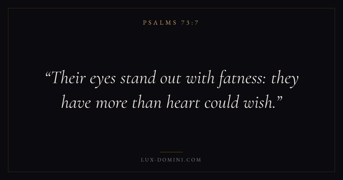 Books / Psalms / Chapter 73 / Verse 7 ← Psalms 73:6 Psalms 73:7 Psalms 73:8 → Their eyes stand out with fatness: they have more than heart could wish. Download verse card Share on Twitter Share on Facebook Pin it ✦ Key themes FaithPrayerPraiseLament Read with Hebrews 11:1Romans 10:17Matthew 6:9Luke 18:1 Related topics Bible verses about faithBible verses about prayerBible verses about thankfulness and gratitudeBible verses about grief and loss ✦ Psalms Chapter 73 verses V. 1 V. 2 V. 3 V. 4 V. 5 V. 6 V. 7 V. 8 V. 9 V. 10 V. 11 V. 12 V. 13 V. 14 V. 15 V. 16 V. 17 V. 18 V. 19 V. 20 V. 21 V. 22 V. 23 V. 24 V. 25 V. 26 V. 27 V. 28