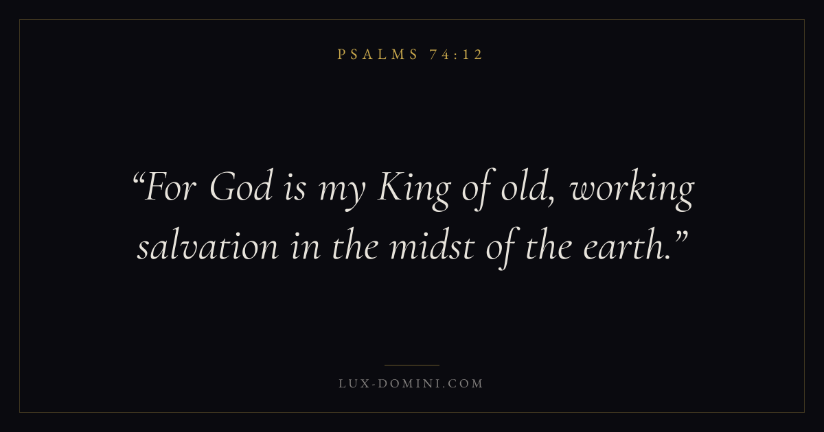 Books / Psalms / Chapter 74 / Verse 12 ← Psalms 74:11 Psalms 74:12 Psalms 74:13 → For God is my King of old, working salvation in the midst of the earth. Download verse card Share on Twitter Share on Facebook Pin it ✦ Key themes FaithPrayerSalvationPraise Read with Hebrews 11:1Romans 10:17Matthew 6:9Luke 18:1 Related topics Bible verses about faithBible verses about prayerBible verses about salvationBible verses about thankfulness and gratitude ✦ Psalms Chapter 74 verses V. 1 V. 2 V. 3 V. 4 V. 5 V. 6 V. 7 V. 8 V. 9 V. 10 V. 11 V. 12 V. 13 V. 14 V. 15 V. 16 V. 17 V. 18 V. 19 V. 20 V. 21 V. 22 V. 23