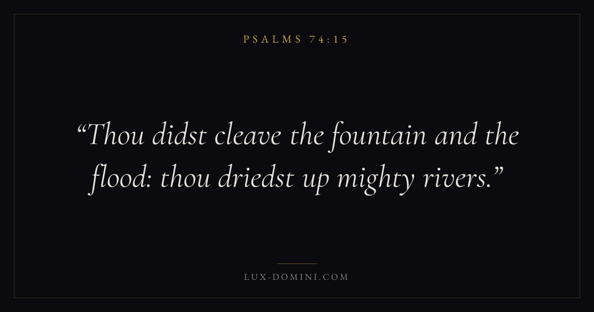 Books / Psalms / Chapter 74 / Verse 15 ← Psalms 74:14 Psalms 74:15 Psalms 74:16 → Thou didst cleave the fountain and the flood: thou driedst up mighty rivers. Download verse card Share on Twitter Share on Facebook Pin it ✦ Key themes FaithPrayerPraiseLament Read with Hebrews 11:1Romans 10:17Matthew 6:9Luke 18:1 Related topics Bible verses about faithBible verses about prayerBible verses about thankfulness and gratitudeBible verses about grief and loss ✦ Psalms Chapter 74 verses V. 1 V. 2 V. 3 V. 4 V. 5 V. 6 V. 7 V. 8 V. 9 V. 10 V. 11 V. 12 V. 13 V. 14 V. 15 V. 16 V. 17 V. 18 V. 19 V. 20 V. 21 V. 22 V. 23