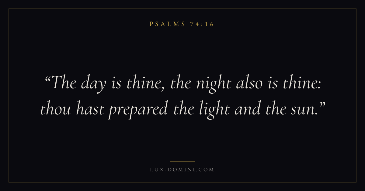 Books / Psalms / Chapter 74 / Verse 16 ← Psalms 74:15 Psalms 74:16 Psalms 74:17 → The day is thine, the night also is thine: thou hast prepared the light and the sun. Download verse card Share on Twitter Share on Facebook Pin it ✦ Key themes FaithPrayerPraiseLament Read with Hebrews 11:1Romans 10:17Matthew 6:9Luke 18:1 Related topics Bible verses about faithBible verses about prayerBible verses about thankfulness and gratitudeBible verses about grief and loss ✦ Psalms Chapter 74 verses V. 1 V. 2 V. 3 V. 4 V. 5 V. 6 V. 7 V. 8 V. 9 V. 10 V. 11 V. 12 V. 13 V. 14 V. 15 V. 16 V. 17 V. 18 V. 19 V. 20 V. 21 V. 22 V. 23