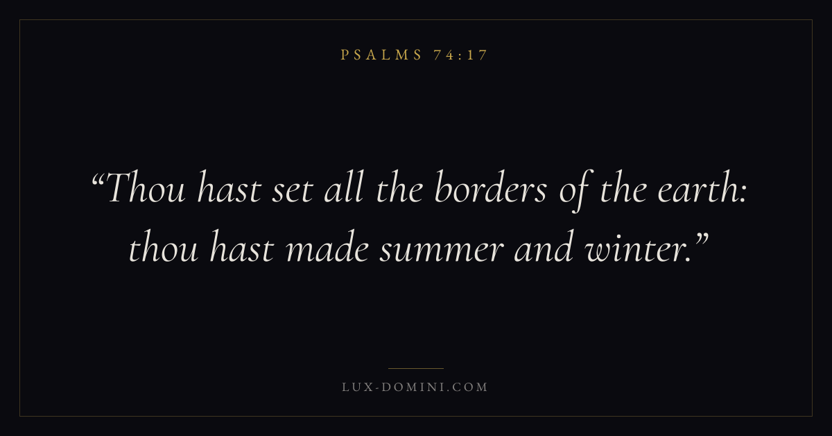 Books / Psalms / Chapter 74 / Verse 17 ← Psalms 74:16 Psalms 74:17 Psalms 74:18 → Thou hast set all the borders of the earth: thou hast made summer and winter. Download verse card Share on Twitter Share on Facebook Pin it ✦ Key themes FaithPrayerPraiseLament Read with Hebrews 11:1Romans 10:17Matthew 6:9Luke 18:1 Related topics Bible verses about faithBible verses about prayerBible verses about thankfulness and gratitudeBible verses about grief and loss ✦ Psalms Chapter 74 verses V. 1 V. 2 V. 3 V. 4 V. 5 V. 6 V. 7 V. 8 V. 9 V. 10 V. 11 V. 12 V. 13 V. 14 V. 15 V. 16 V. 17 V. 18 V. 19 V. 20 V. 21 V. 22 V. 23