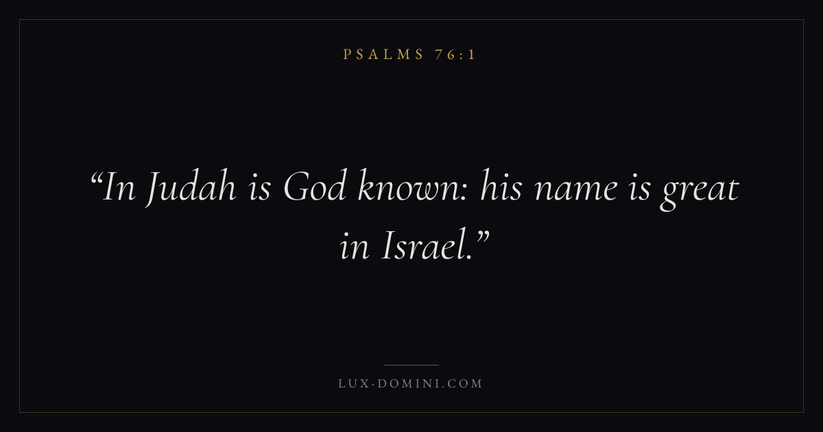 Books / Psalms / Chapter 76 / Verse 1 ← Psalms 75:10 Psalms 76:1 Psalms 76:2 → In Judah is God known: his name is great in Israel. Download verse card Share on Twitter Share on Facebook Pin it ✦ Key themes FaithPrayerWisdomPraise Read with Hebrews 11:1Romans 10:17Matthew 6:9Luke 18:1 Related topics Bible verses about faithBible verses about prayerBible verses about wisdomBible verses about thankfulness and gratitude ✦ Psalms Chapter 76 verses V. 1 V. 2 V. 3 V. 4 V. 5 V. 6 V. 7 V. 8 V. 9 V. 10 V. 11 V. 12