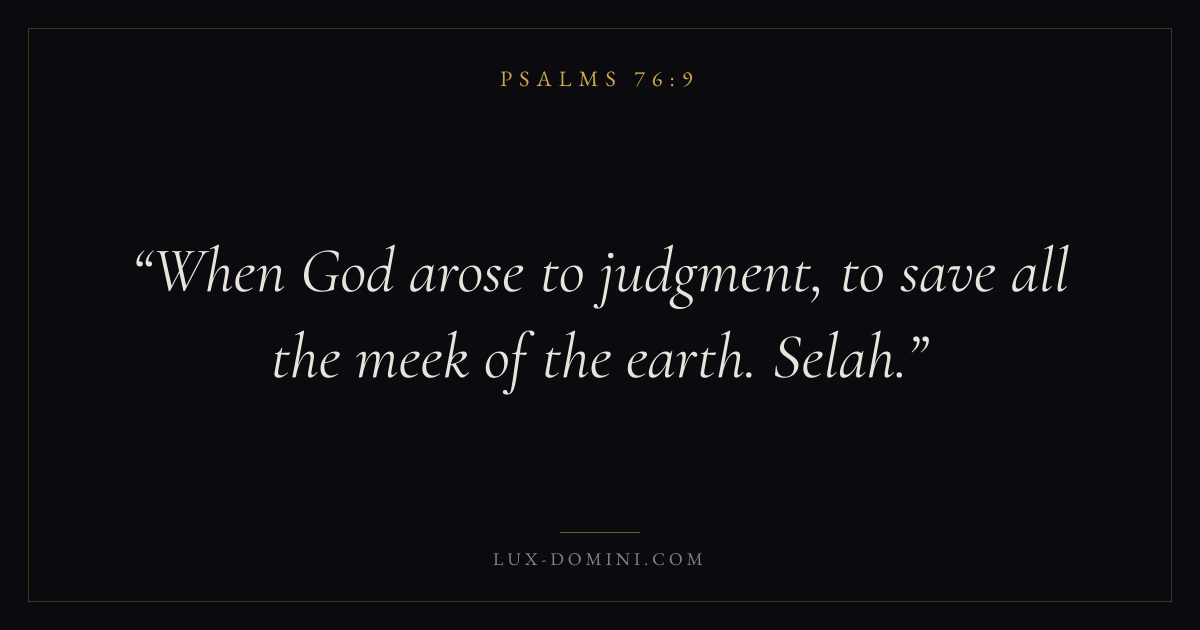 Books / Psalms / Chapter 76 / Verse 9 ← Psalms 76:8 Psalms 76:9 Psalms 76:10 → When God arose to judgment, to save all the meek of the earth. Selah. Download verse card Share on Twitter Share on Facebook Pin it ✦ Key themes FaithSuffering and trialsPrayerJustice and mercyPraise Read with Hebrews 11:1Romans 10:17Romans 8:182 Corinthians 4:17 Related topics Bible verses about faithBible verses about suffering and trialsBible verses about prayerBible verses about justice and mercyBible verses about thankfulness and gratitude ✦ Psalms Chapter 76 verses V. 1 V. 2 V. 3 V. 4 V. 5 V. 6 V. 7 V. 8 V. 9 V. 10 V. 11 V. 12