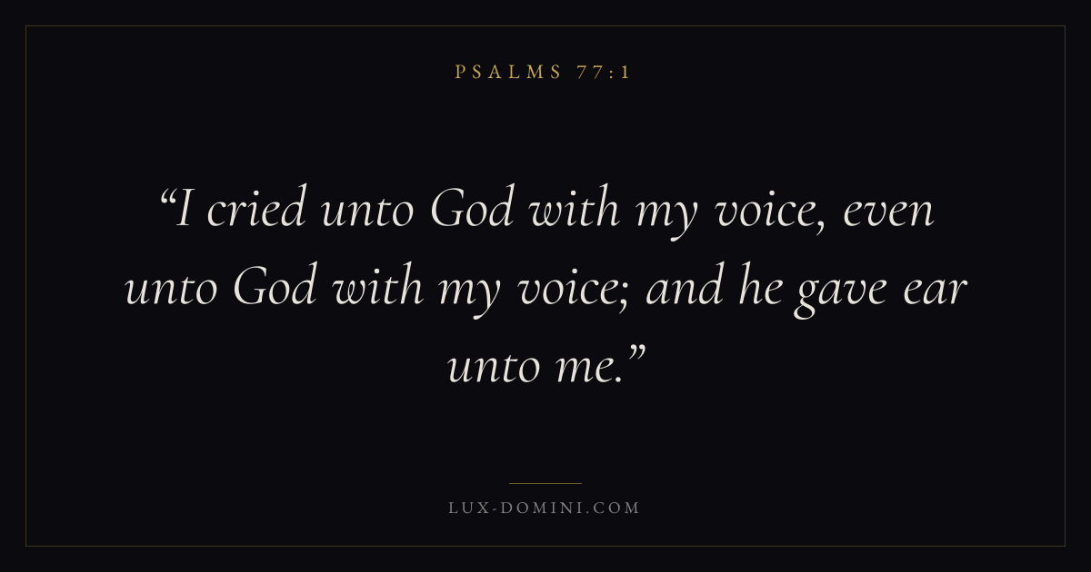 Books / Psalms / Chapter 77 / Verse 1 ← Psalms 76:12 Psalms 77:1 Psalms 77:2 → I cried unto God with my voice, even unto God with my voice; and he gave ear unto me. Download verse card Share on Twitter Share on Facebook Pin it ✦ Key themes FaithPrayerGracePraise Read with Hebrews 11:1Romans 10:17Matthew 6:9Luke 18:1 Related topics Bible verses about faithBible verses about prayerBible verses about graceBible verses about thankfulness and gratitude ✦ Psalms Chapter 77 verses V. 1 V. 2 V. 3 V. 4 V. 5 V. 6 V. 7 V. 8 V. 9 V. 10 V. 11 V. 12 V. 13 V. 14 V. 15 V. 16 V. 17 V. 18 V. 19 V. 20