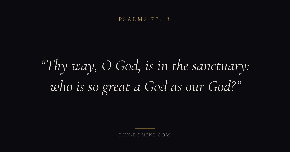 Books / Psalms / Chapter 77 / Verse 13 ← Psalms 77:12 Psalms 77:13 Psalms 77:14 → Thy way, O God, is in the sanctuary: who is so great a God as our God? Download verse card Share on Twitter Share on Facebook Pin it ✦ Key themes FaithHopePrayerPraise Read with Hebrews 11:1Romans 10:17Romans 8:24Revelation 21:4 Related topics Bible verses about faithBible verses about hopeBible verses about prayerBible verses about thankfulness and gratitude ✦ Psalms Chapter 77 verses V. 1 V. 2 V. 3 V. 4 V. 5 V. 6 V. 7 V. 8 V. 9 V. 10 V. 11 V. 12 V. 13 V. 14 V. 15 V. 16 V. 17 V. 18 V. 19 V. 20