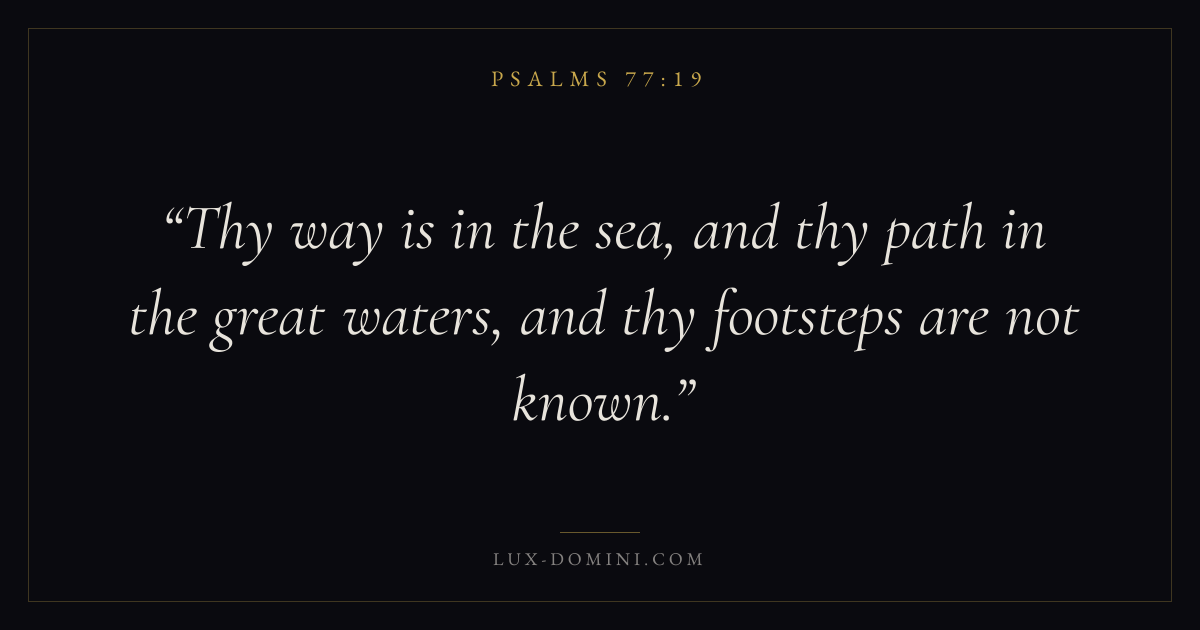 Books / Psalms / Chapter 77 / Verse 19 ← Psalms 77:18 Psalms 77:19 Psalms 77:20 → Thy way is in the sea, and thy path in the great waters, and thy footsteps are not known. Download verse card Share on Twitter Share on Facebook Pin it ✦ Key themes FaithHopePrayerPraise Read with Hebrews 11:1Romans 10:17Romans 8:24Revelation 21:4 Related topics Bible verses about faithBible verses about hopeBible verses about prayerBible verses about thankfulness and gratitude ✦ Psalms Chapter 77 verses V. 1 V. 2 V. 3 V. 4 V. 5 V. 6 V. 7 V. 8 V. 9 V. 10 V. 11 V. 12 V. 13 V. 14 V. 15 V. 16 V. 17 V. 18 V. 19 V. 20