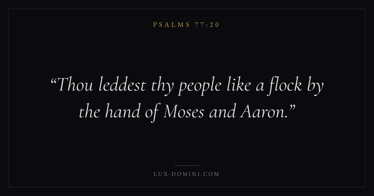 Books / Psalms / Chapter 77 / Verse 20 ← Psalms 77:19 Psalms 77:20 Psalms 78:1 → Thou leddest thy people like a flock by the hand of Moses and Aaron. Download verse card Share on Twitter Share on Facebook Pin it ✦ Key themes FaithHopePrayerPraise Read with Hebrews 11:1Romans 10:17Romans 8:24Revelation 21:4 Related topics Bible verses about faithBible verses about hopeBible verses about prayerBible verses about thankfulness and gratitude ✦ Psalms Chapter 77 verses V. 1 V. 2 V. 3 V. 4 V. 5 V. 6 V. 7 V. 8 V. 9 V. 10 V. 11 V. 12 V. 13 V. 14 V. 15 V. 16 V. 17 V. 18 V. 19 V. 20