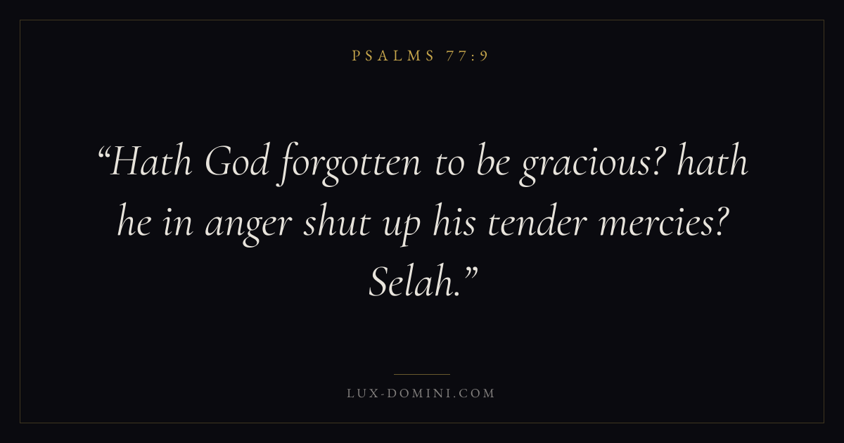Books / Psalms / Chapter 77 / Verse 9 ← Psalms 77:8 Psalms 77:9 Psalms 77:10 → Hath God forgotten to be gracious? hath he in anger shut up his tender mercies? Selah. Download verse card Share on Twitter Share on Facebook Pin it ✦ Key themes FaithPrayerGracePraise Read with Hebrews 11:1Romans 10:17Matthew 6:9Luke 18:1 Related topics Bible verses about faithBible verses about prayerBible verses about graceBible verses about thankfulness and gratitude ✦ Psalms Chapter 77 verses V. 1 V. 2 V. 3 V. 4 V. 5 V. 6 V. 7 V. 8 V. 9 V. 10 V. 11 V. 12 V. 13 V. 14 V. 15 V. 16 V. 17 V. 18 V. 19 V. 20