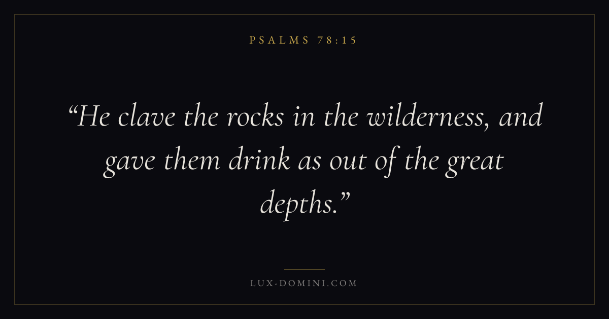 Books / Psalms / Chapter 78 / Verse 15 ← Psalms 78:14 Psalms 78:15 Psalms 78:16 → He clave the rocks in the wilderness, and gave them drink as out of the great depths. Download verse card Share on Twitter Share on Facebook Pin it ✦ Key themes FaithPrayerPraiseLament Read with Hebrews 11:1Romans 10:17Matthew 6:9Luke 18:1 Related topics Bible verses about faithBible verses about prayerBible verses about thankfulness and gratitudeBible verses about grief and loss ✦ Psalms Chapter 78 verses V. 1 V. 2 V. 3 V. 4 V. 5 V. 6 V. 7 V. 8 V. 9 V. 10 V. 11 V. 12 V. 13 V. 14 V. 15 V. 16 V. 17 V. 18 V. 19 V. 20 V. 21 V. 22 V. 23 V. 24 V. 25 V. 26 V. 27 V. 28 V. 29 V. 30 V. 31 V. 32 V. 33 V. 34 V. 35 V. 36 V. 37 V. 38 V. 39 V. 40 V. 41 V. 42 V. 43 V. 44 V. 45 V. 46 V. 47 V. 48 V. 49 V. 50 V. 51 V. 52 V. 53 V. 54 V. 55 V. 56 V. 57 V. 58 V. 59 V. 60 V. 61 V. 62 V. 63 V. 64 V. 65 V. 66 V. 67 V. 68 V. 69 V. 70 V. 71 V. 72