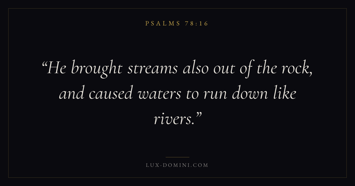 Books / Psalms / Chapter 78 / Verse 16 ← Psalms 78:15 Psalms 78:16 Psalms 78:17 → He brought streams also out of the rock, and caused waters to run down like rivers. Download verse card Share on Twitter Share on Facebook Pin it ✦ Key themes FaithPrayerPraiseLament Read with Hebrews 11:1Romans 10:17Matthew 6:9Luke 18:1 Related topics Bible verses about faithBible verses about prayerBible verses about thankfulness and gratitudeBible verses about grief and loss ✦ Psalms Chapter 78 verses V. 1 V. 2 V. 3 V. 4 V. 5 V. 6 V. 7 V. 8 V. 9 V. 10 V. 11 V. 12 V. 13 V. 14 V. 15 V. 16 V. 17 V. 18 V. 19 V. 20 V. 21 V. 22 V. 23 V. 24 V. 25 V. 26 V. 27 V. 28 V. 29 V. 30 V. 31 V. 32 V. 33 V. 34 V. 35 V. 36 V. 37 V. 38 V. 39 V. 40 V. 41 V. 42 V. 43 V. 44 V. 45 V. 46 V. 47 V. 48 V. 49 V. 50 V. 51 V. 52 V. 53 V. 54 V. 55 V. 56 V. 57 V. 58 V. 59 V. 60 V. 61 V. 62 V. 63 V. 64 V. 65 V. 66 V. 67 V. 68 V. 69 V. 70 V. 71 V. 72
